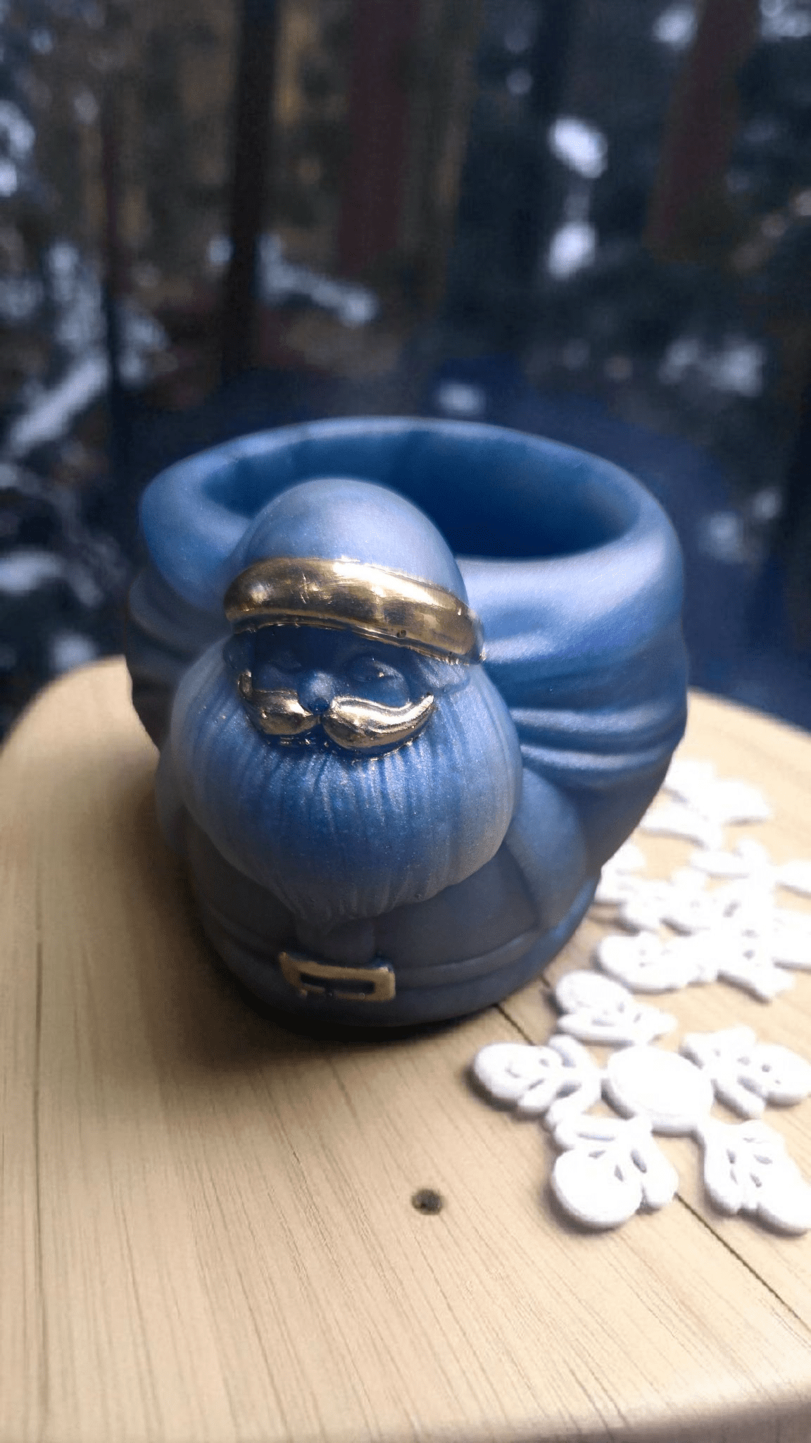 The product showcases a dramatic, deep cobalt blue that has been treated with an iridescent pearl shimmer, giving it a magical, colour-shifting finish. This cool, frosty blue is beautifully contrasted by metallic silver accents on Santa’s moustache, belt buckle, and hat trim, lending an air of luxury and antique glamour.