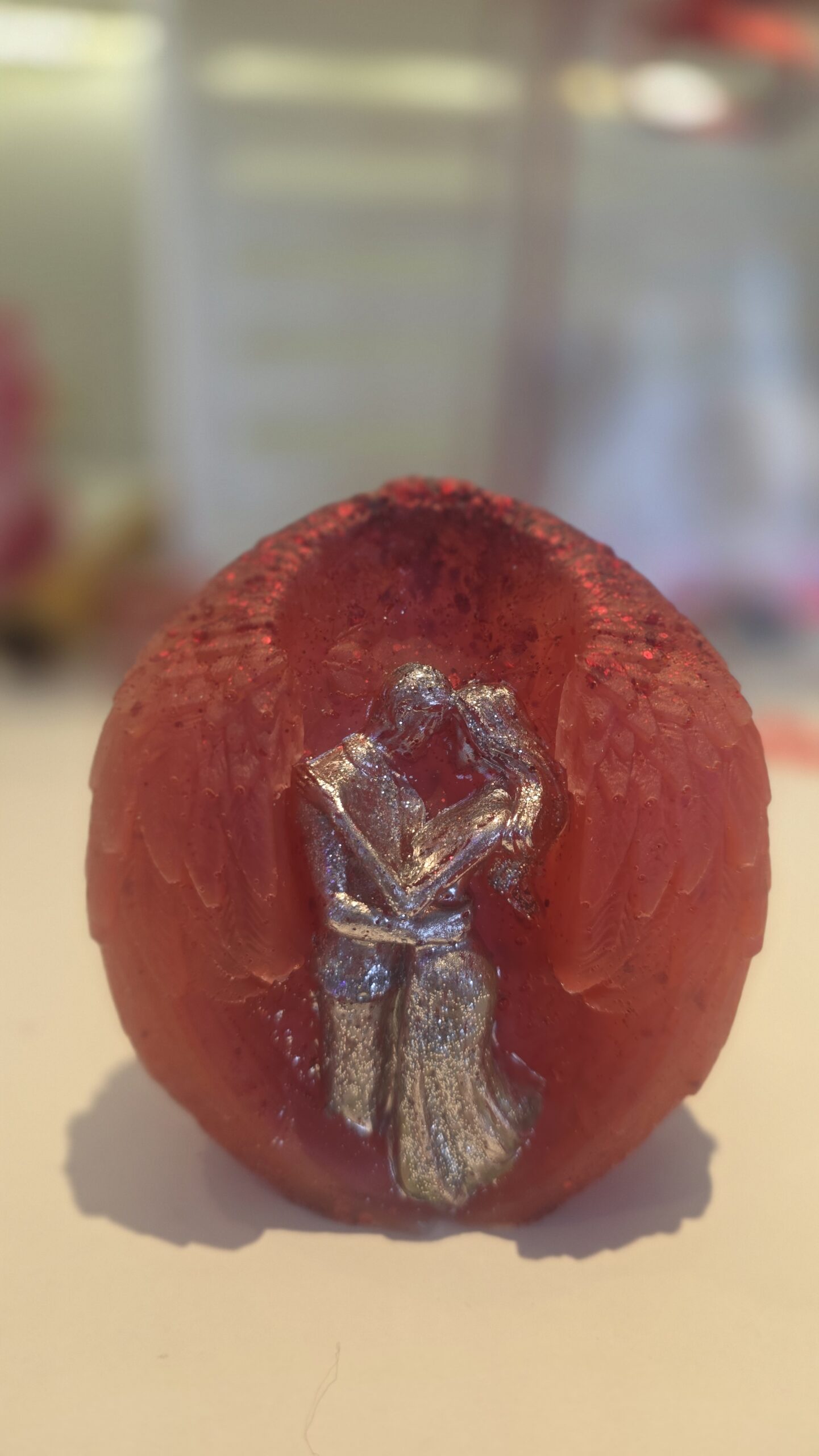 Capture the essence of devotion with this hand-poured resin masterpiece. This sculpture features an intimate couple held within the protective curve of celestial wings, symbolizing a love that is both grounded and divine. Finished in a rich, translucent crimson with shimmering glitter accents, the silver-toned figures stand out in high-contrast brilliance.