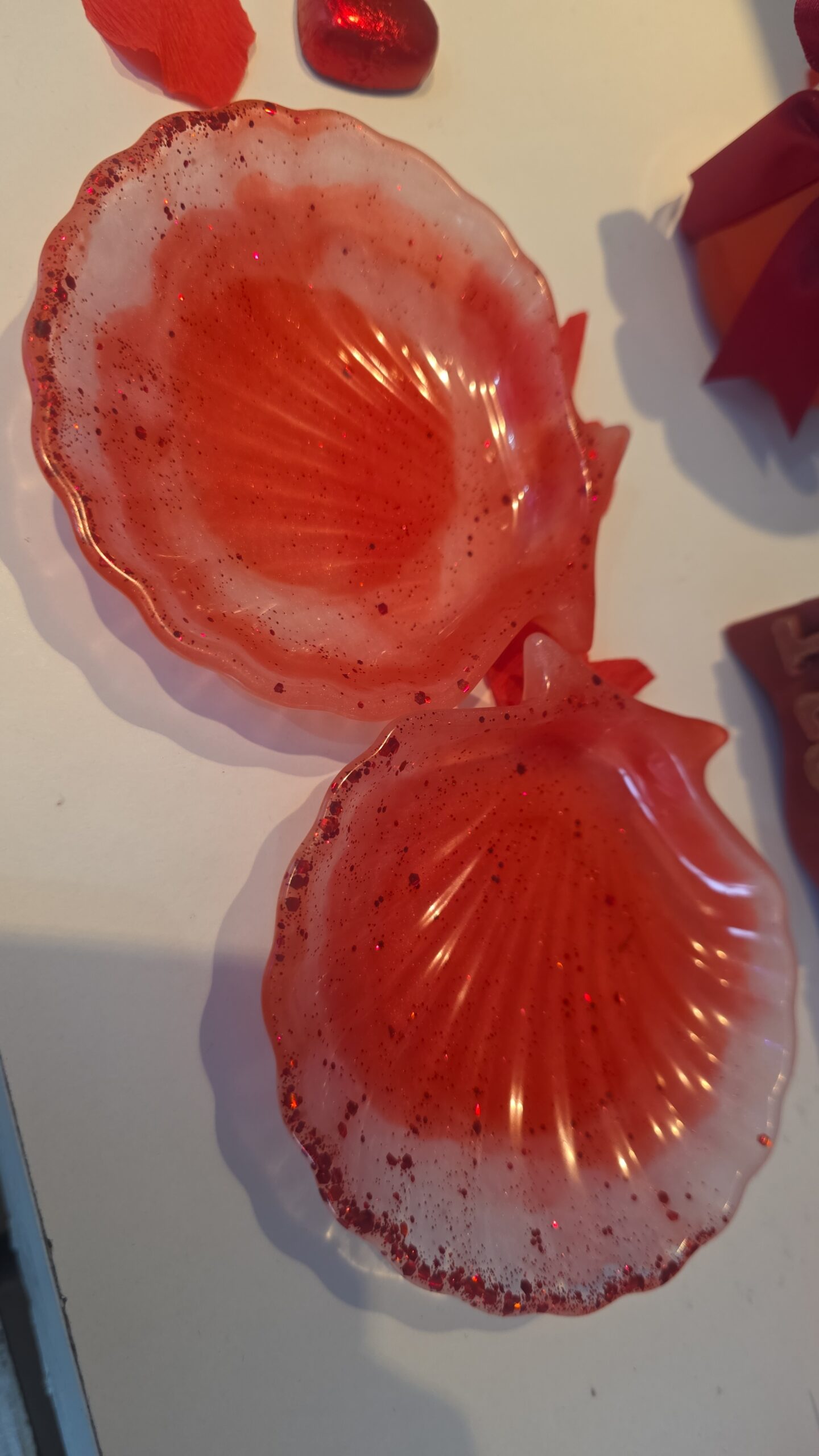 Add a pop of colour to your home with these handmade resin seashell trays ( set of 2 )! Featuring a gorgeous ombre effect and sparkling red glitter accents, each piece is individually poured, making your dish one-of-a-kind.