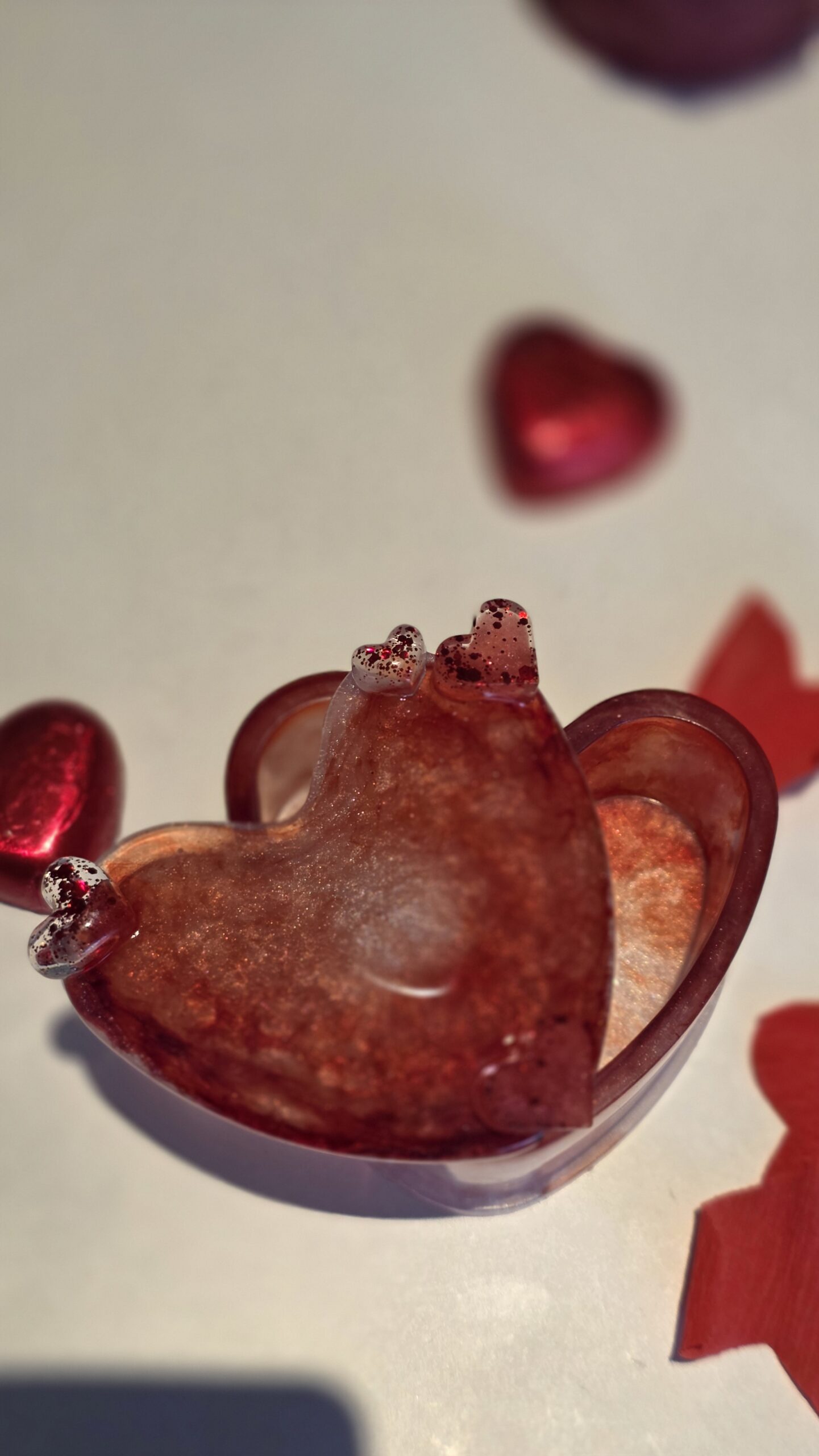 Celebrate love with this stunning heart-shaped resin trinket box. The piece features a deep, shimmering crimson and gold-flecked base that creates a captivating glow when it catches the light. The removable lid is uniquely adorned with miniature accent hearts, each detailed with delicate crimson speckles for an added layer of texture and charm.