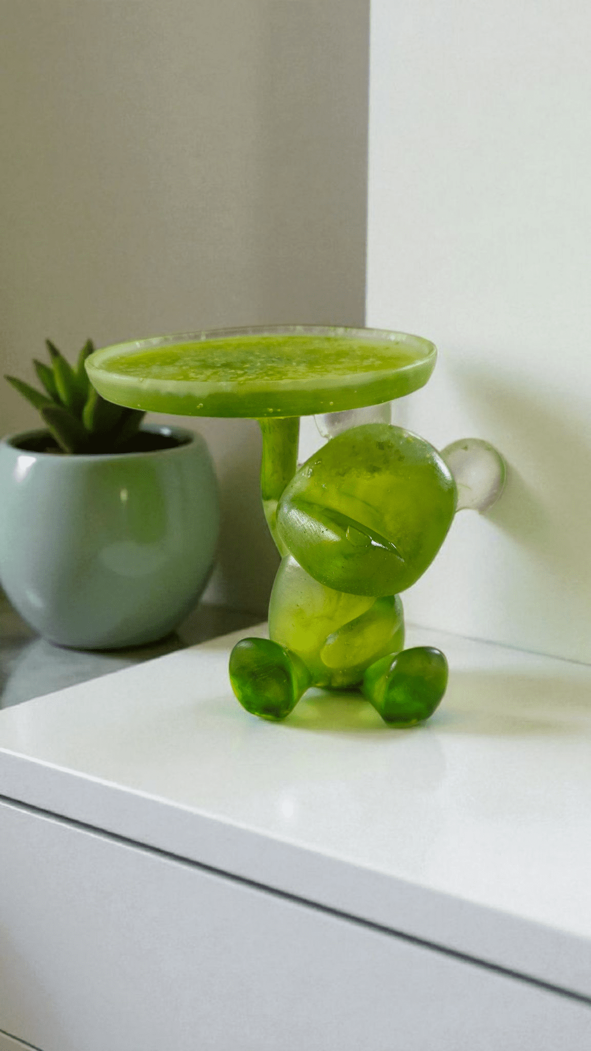 Add a splash of vibrant colour and playful design to any room with this unique sculpted trinket dish. Crafted from luminous, semi-translucent lime-green resin, this piece features a charming, abstract figure supporting a flat, circular tray—like a friendly frog holding a lily pad!