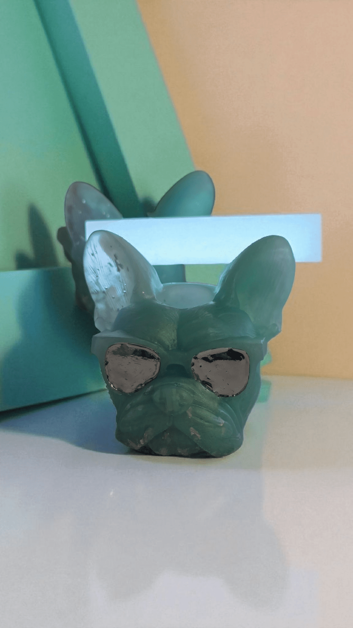 Give your surfaces some attitude with this irresistibly cool French Bulldog accent holder. Cast in a gorgeous, semi-translucent mint green resin, this Frenchie wears a pair of mirror-finish aviator sunglasses that reflect light and confidence. Use it to hold your make up brushes or anything else or as a statement piece of pop culture art. It’s the perfect gift for dog lovers and anyone with a playful, modern aesthetic.